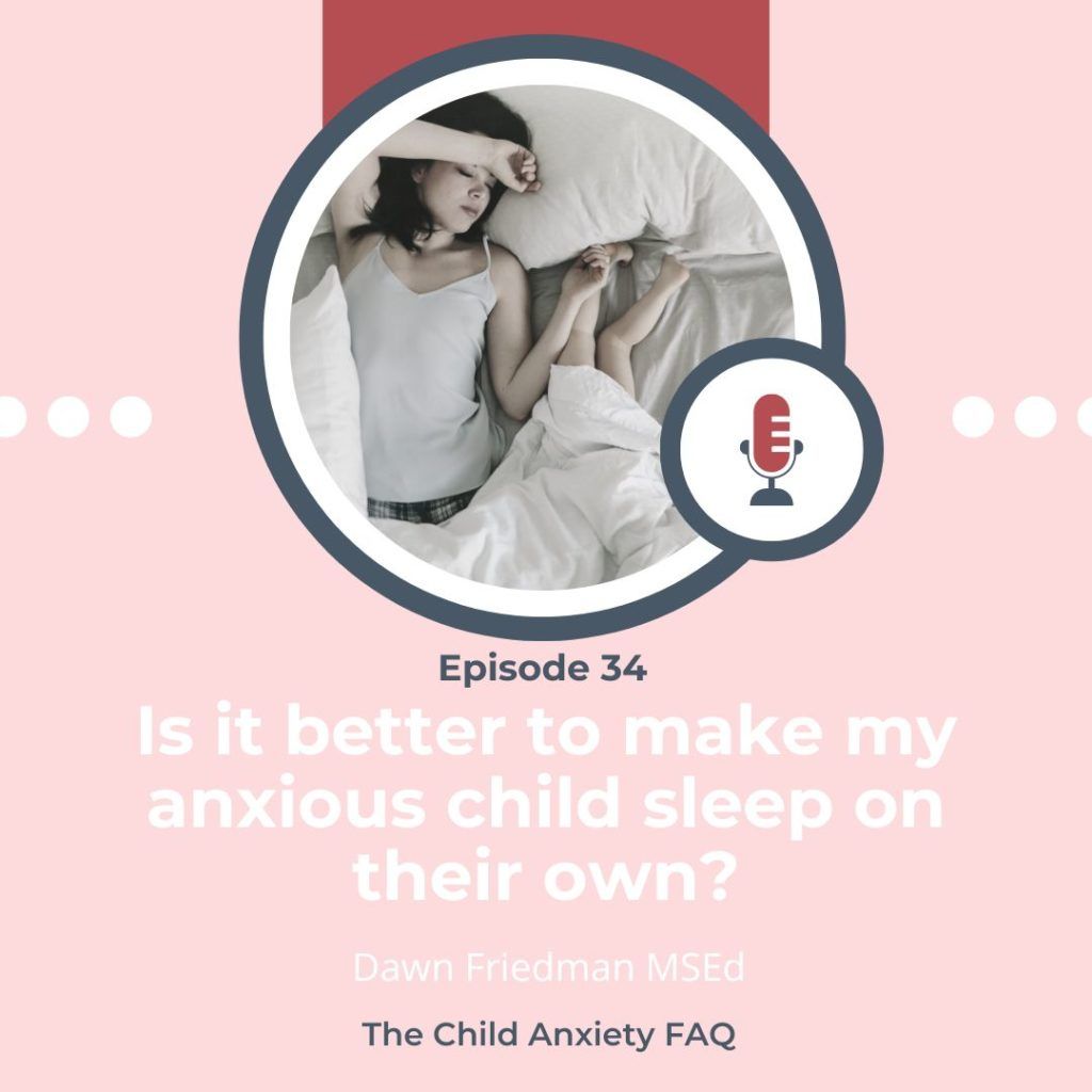 Last week we talked about whether or not co-sleeping causes separation anxiety and concluded that no, it’s more complicated than that and this week’s question is related so I scheduled them right next to each other. This one is: Is it better to make my anxious child sleep on their own? Let’s go through the whole question with some details disguised to protect the confidentiality of the family. This family has an older child — older elementary — who wants to sleep with heir parents because when they sleep alone, they wake up afraid and come in. The parents find this disruptive for everyone’s sleep but also want to be supportive. They want to know, is it better to ask their child to sleep on their own even when they’re scared? Or is it better to give in and let them climb into bed with their parents.